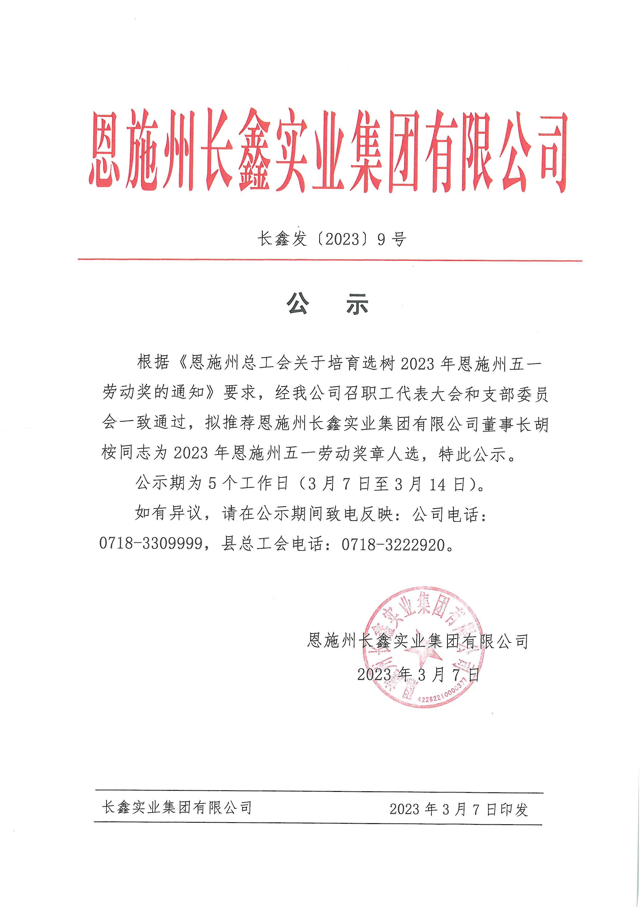 思施州長鑫實業(yè)集有限公司-長鑫發(fā)(2023)9號